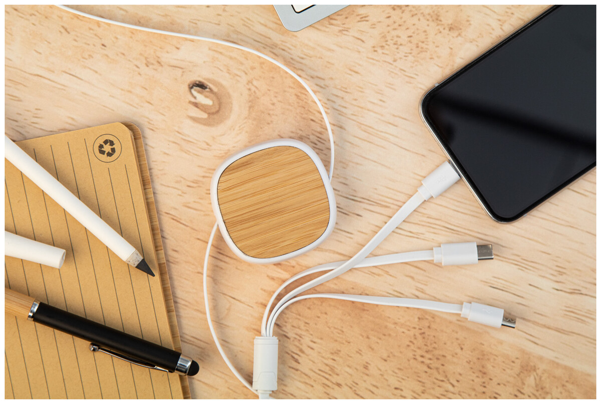 Teleskopický nabíjecí kabel USB z recyklovaného ABS a bambusu. S konektory micro USB, USB-C a Lightning. Se vstupy USB a USB-C.