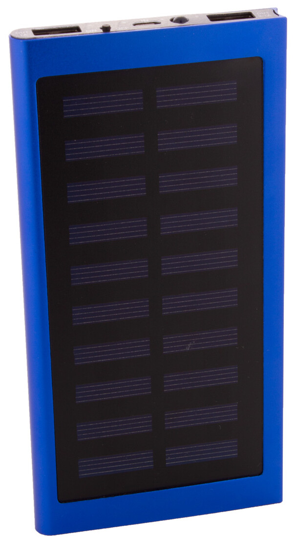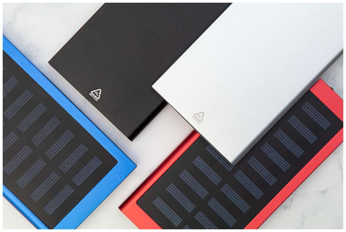 USB power banka v pouzdře z recyklovaného hliníku se zabudovanou solární nabíječkou a 4000 mAh baterií. Se 2 porty USB a 1 portem USB-C pro nabíječku. Vstupní port USB-C. Včetně USB nabíjecího kabelu.