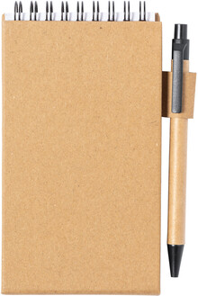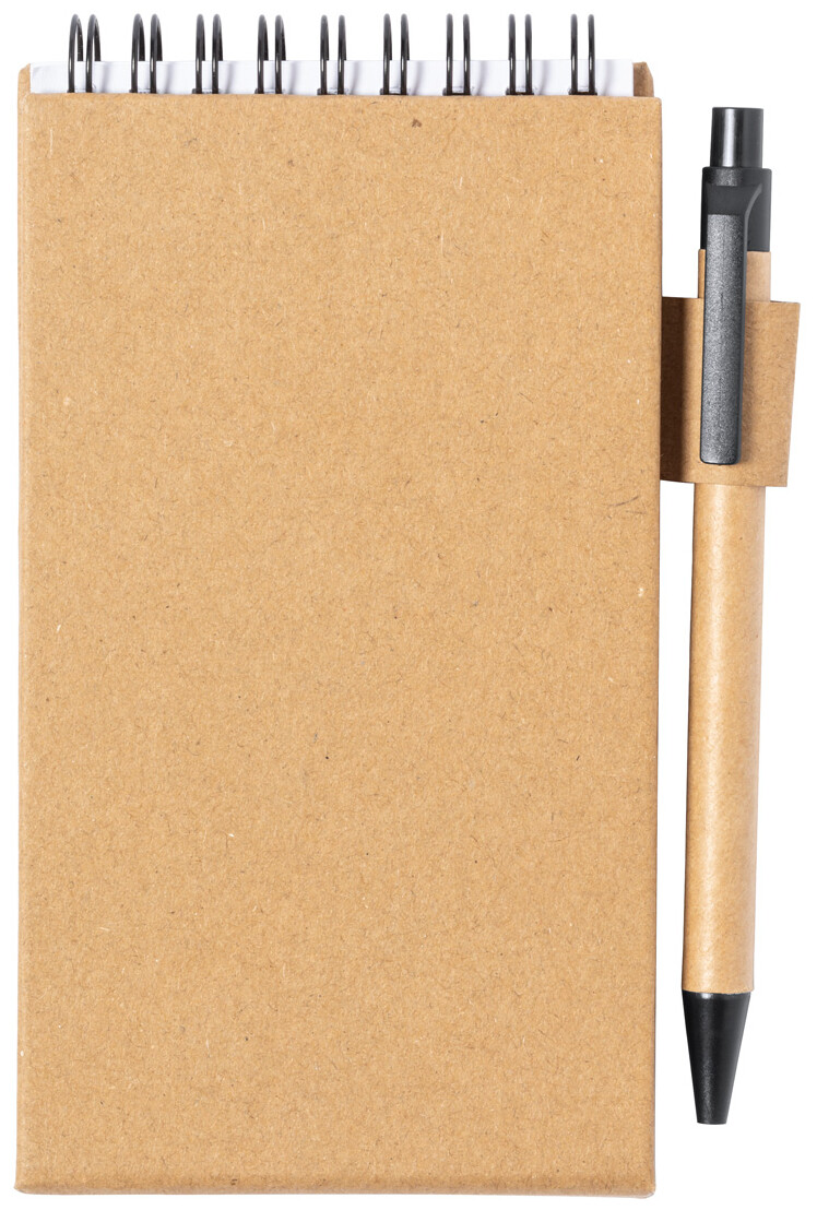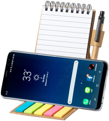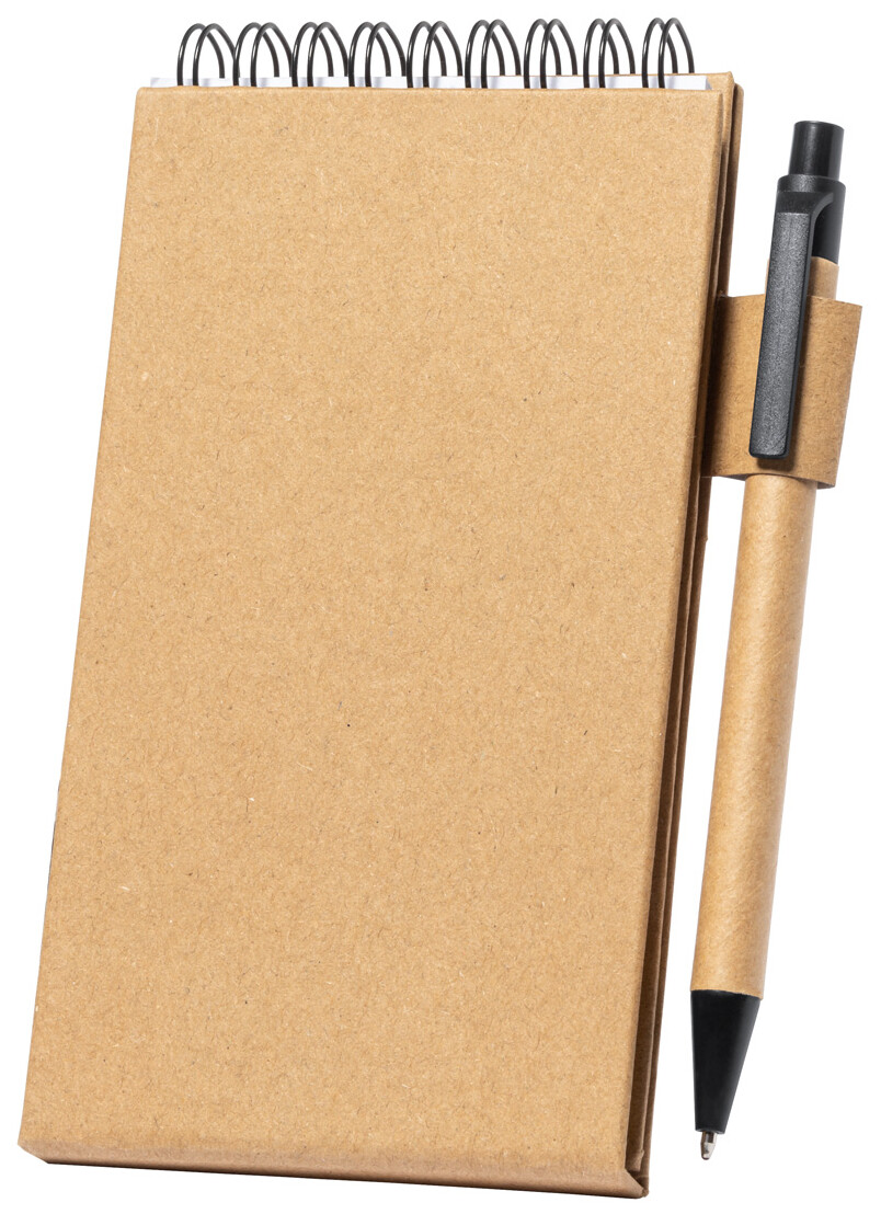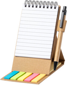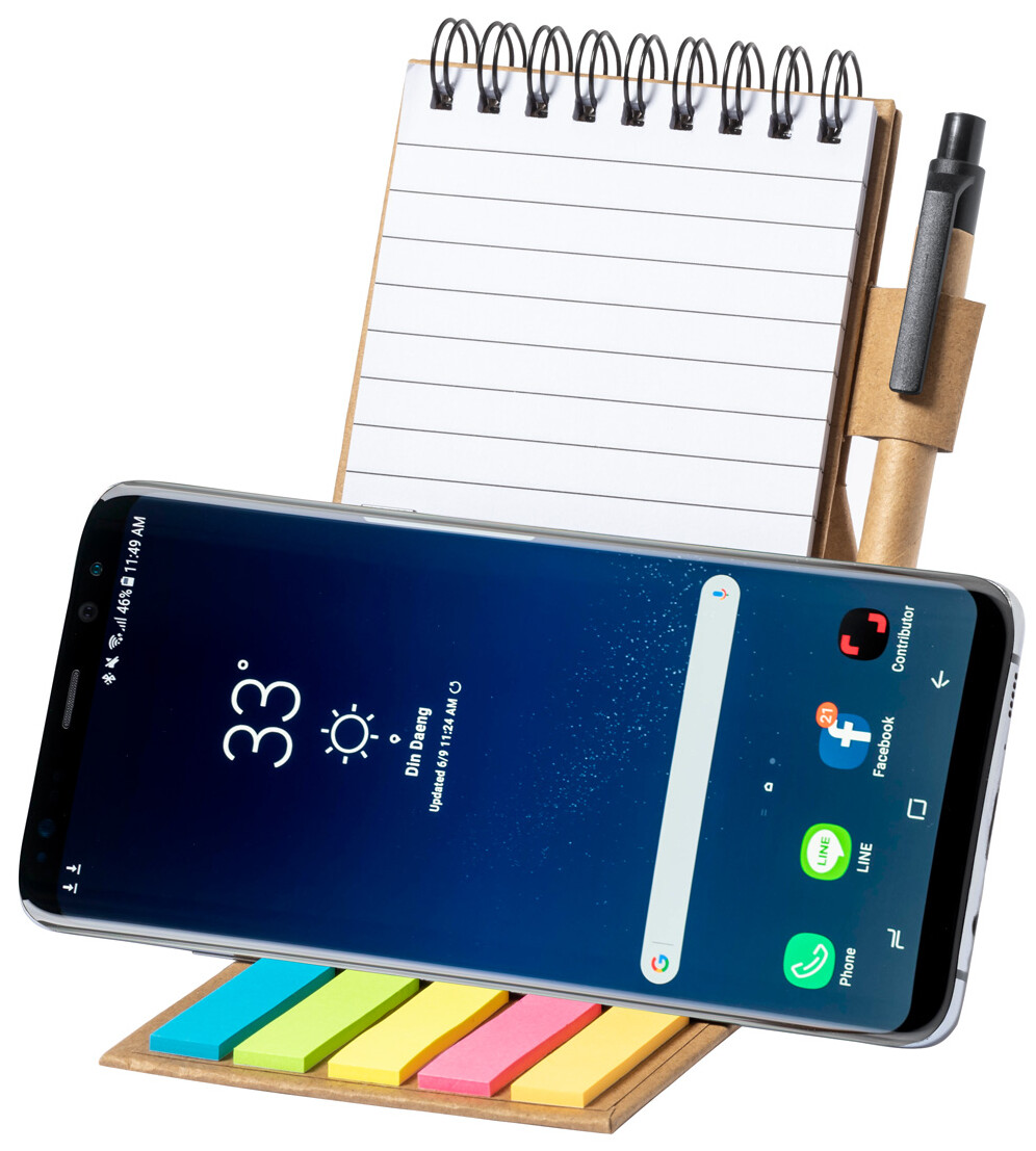 Spirálový poznámkový blok z recyklovaného papíru s 30 linkovanými listy, 25 samolepicími papírky a 125 značovači stránek (v 5 různých barvách). S funkcí držáku mobilního telefonu. Včetně kuličkového pera z recyklovaného papíru s modrou náplní.