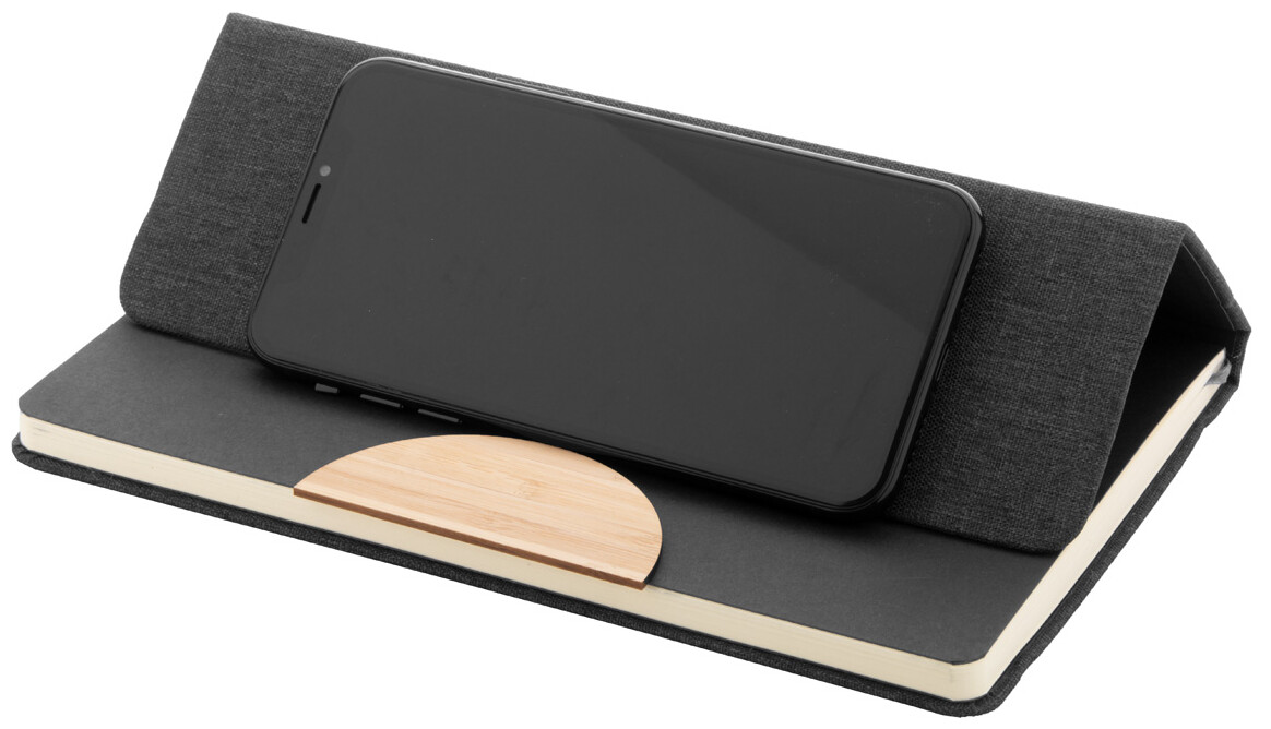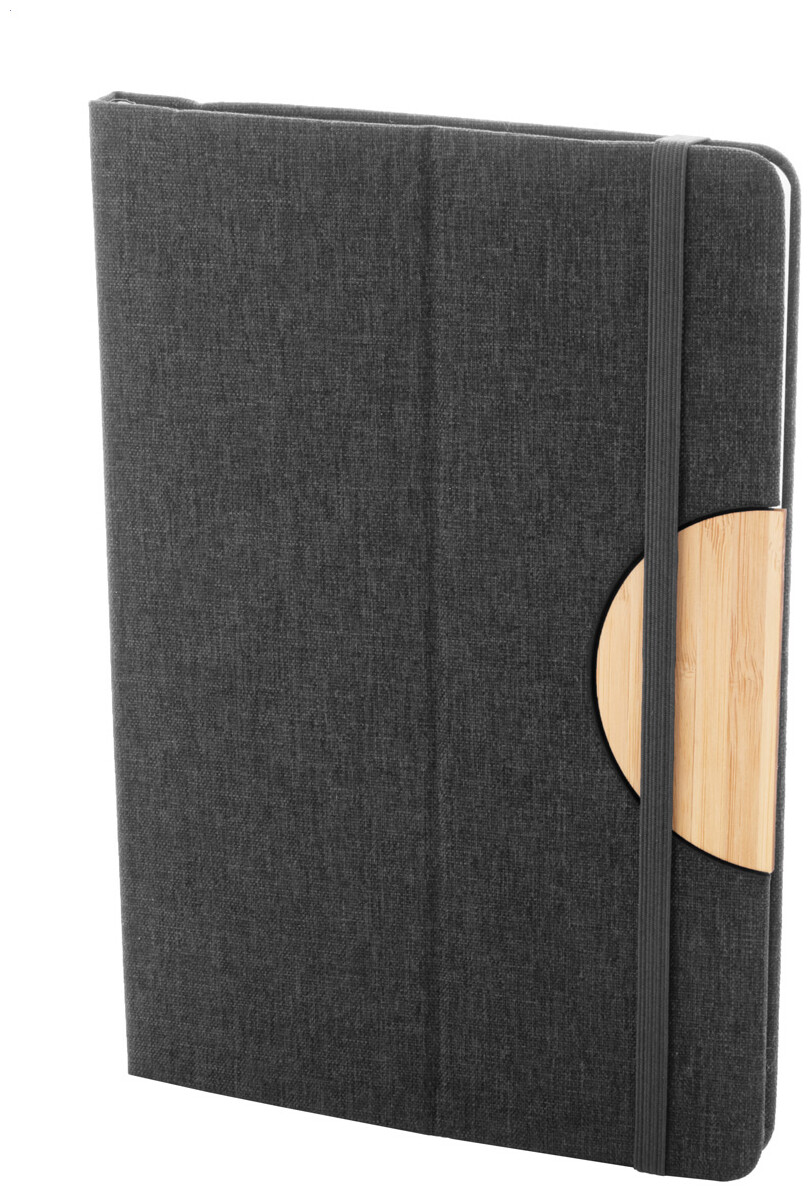 Blok A5 s deskami potaženými polyesterem RPET s bambusovou vložkou a funkcí držáku na mobil. S 80 linkovanými listy z recyklovaného papíru, záložkou a gumičkou.