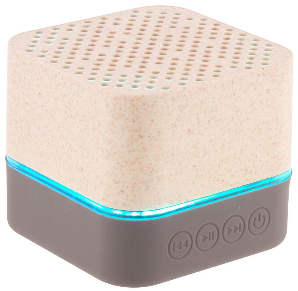 Bezdrátový reproduktor v ekologickém plastovém krytu z pšeničné slámy s gumovou spodní částí, vícebarevným LED světlem a vestavěnou dobíjecí baterií. S funkcemi handsfree volání a přehrávače micro SD. Včetně nabíjecího kabelu USB.