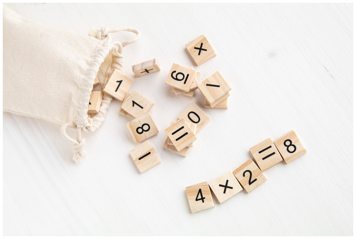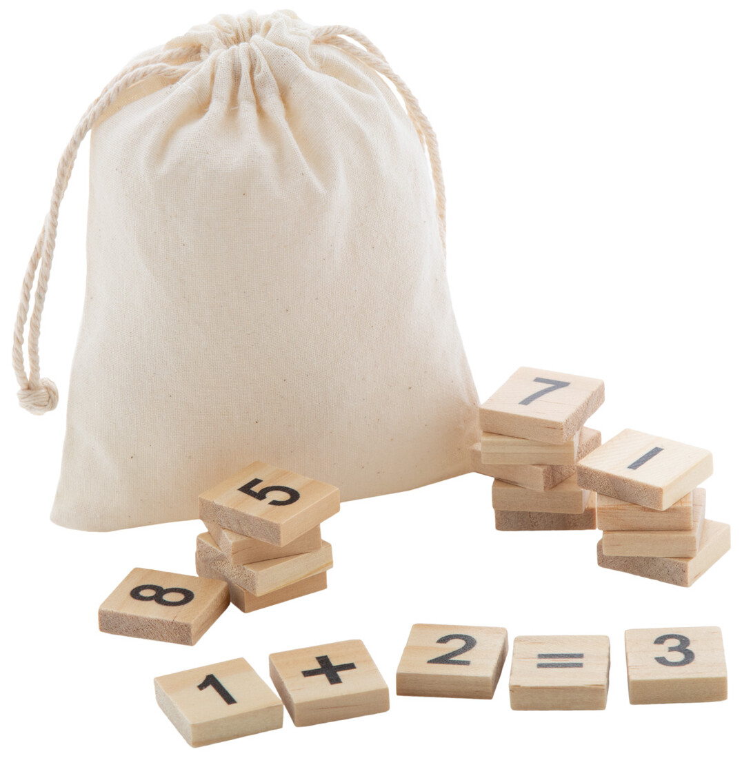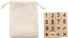 Dřevěná vzdělávací hra na počítání v bavlněném sáčku se stahovací šňůrkou. S 32 dílky, včetně čísel a matematických operací.