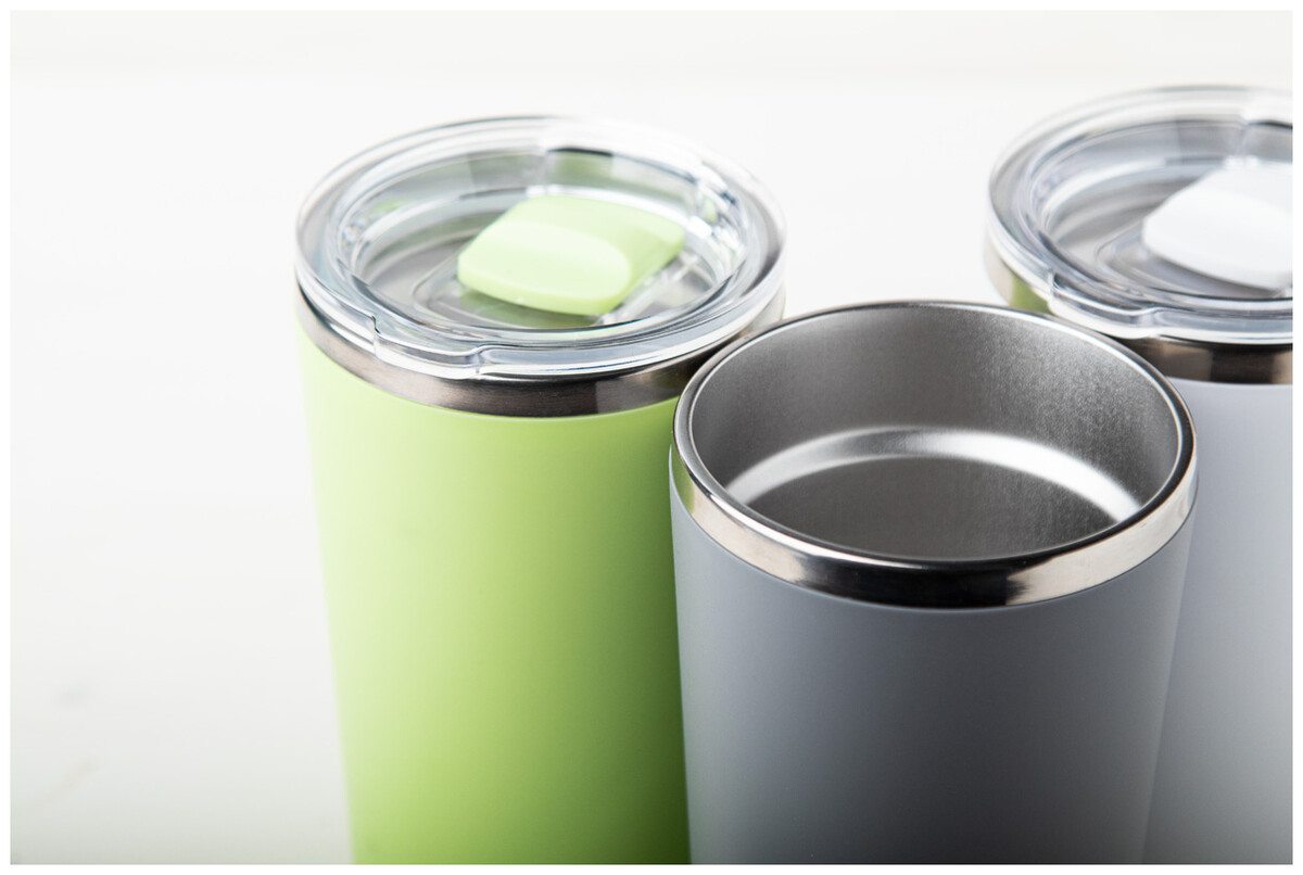 PP plastem pokrytý dvoustěnný, nerezový termo hrnek s víčkem na pití. 500 ml.