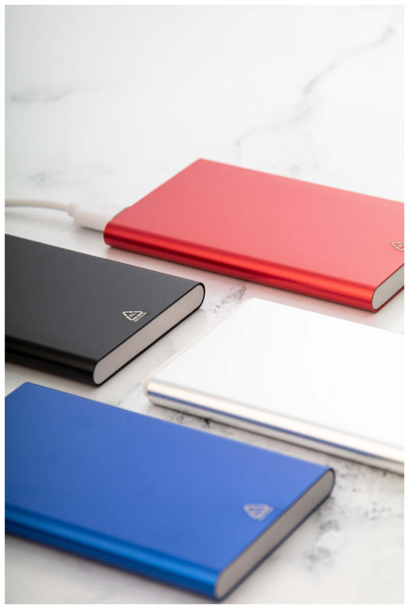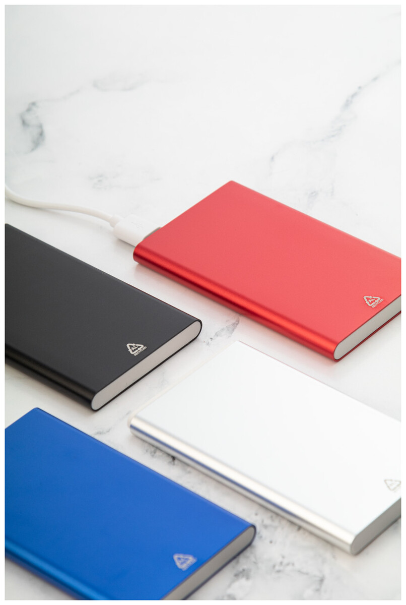 USB power banka v pouzdře z recyklovaného hliníku s 4000 mAh baterií. S 1 portem USB a 1 portem USB-C pro nabíječku. Vstupní port USB-C. Včetně USB nabíjecího kabelu.
