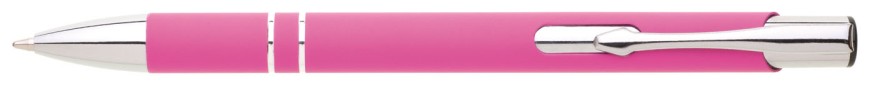 Hliníková propiska se stříbrnými doplňky a měkkým pogumovaným povrchem soft v růžové barvě. Modře píšící.