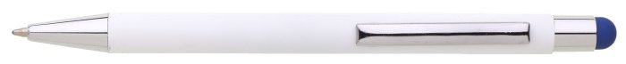 Bílá kovová propiska se soft povrchem a modrým touch koncem. Logo po vylaserování je v barvě touch – leskle modré.