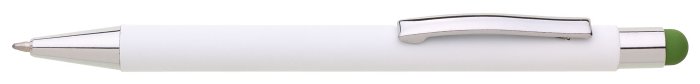 Bílá kovová propiska se soft povrchem a zeleným touch koncem. Logo po vylaserování je v barvě touch – leskle zelená.