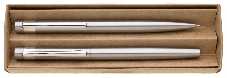 Sada propisky a rolleru z recyklované nerezové oceli, dodávána v papírové krabičce s korkovým přebalem