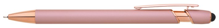 Kovová propiska se soft povrchem, touch koncovkou a doplňky v růžovo-zlaté barvě. Laserované logo je lesklé, růžovo-zlaté. Náplň semigelová, modře píšící.
