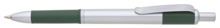 Propiska s matným stříbrným tělem a doplňky má tmavě zelený úchyt a zadní část těla. Náplň X20, modře píšící.