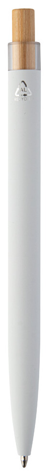 Kuličkové pero z recyklovaného hliníku s pogumovaným povrchem, bambusovým tlačítkem a chromovým klipem. Se speciální vrstvou pro zrcadlové laserové gravírování. S modrou náplní.