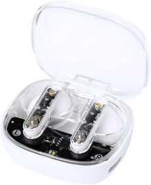 Poloprůhledná, skutečně bezdrátová stereofonní sluchátka (TWS) s viditelnými elektronickými součástmi a funkcí hands-free volání. V poloprůhledném plastovém pouzdře s nabíječkou. Včetně nabíjecího kabelu USB.