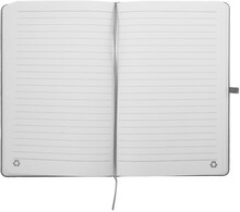 Blok potažený recyklovanou bavlnou s 80 linkovanými listy z recyklovaného papíru. Se záložkou v odpovídající barvě, gumičkou a držákem na pero. Velikost A5.