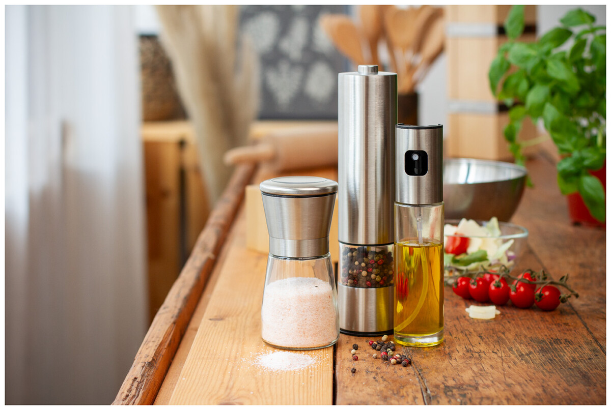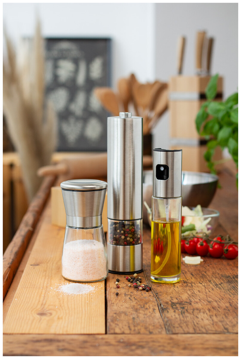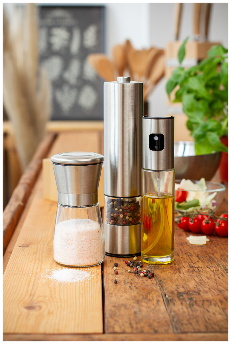 Nerezový ruční mlýnek na sůl a pepř s keramickým jádrem mlýnku a skleněnou nádobou, 180 ml.