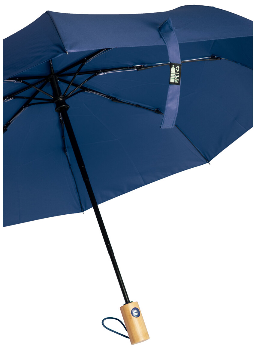 Plně automatický (otevřít/zavřít), větruodolný skládací deštník s 8 panely v pouzdře v odpovídající barvě. S kovovým rámem, sklolaminátovými žebry a bambusovou rukojetí. Pongee 190T RPET. S výrazným štítkem RPET.