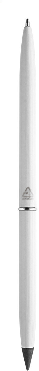Otočné kuličkové pero 2v1 z recyklovaného hliníku a pero bez inkoustu. S modrou náplní a špičkou z kovové slitiny, která oxiduje papír. Toto pero píše podobně jako tužka a navíc je stíratelné.