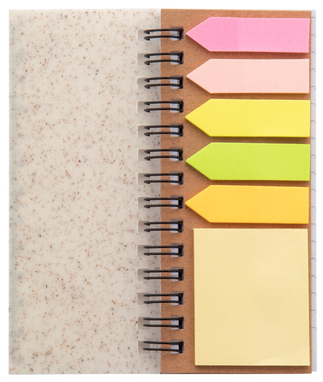Ekologický spirálový blok potažený plastem z pšeničné slámy se 40 linkovanými listy z recyklovaného papíru, 25 lepícími papírky a 125 popisovači stránek (v 5 různých barvách). S pravítkem 12 cm na deskách.