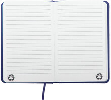 Blok potažený recyklovanou PU kůží se 100 linkovanými listy z recyklovaného papíru. Se záložkou v odpovídající barvě a gumičkou. Velikost A6.