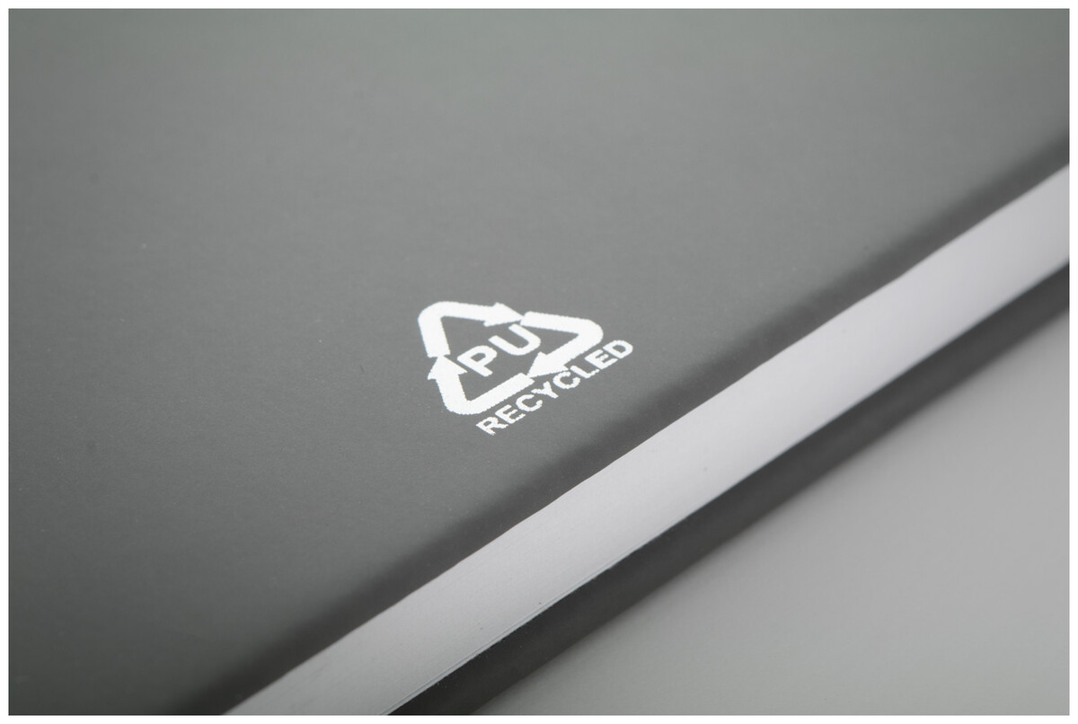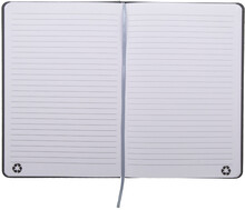 Blok potažený recyklovanou PU kůží se 100 linkovanými listy z recyklovaného papíru. Se záložkou v odpovídající barvě a gumičkou. Velikost A5.