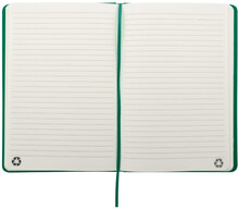 Blok potažený recyklovanou PU kůží se 100 linkovanými listy z recyklovaného papíru. Se záložkou v odpovídající barvě a gumičkou. Velikost A5.