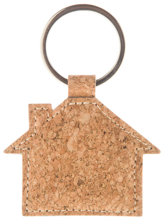 Přívěsek na klíče z přírodního korku a PU kůže ve tvaru domečku s kovovým kroužkem.