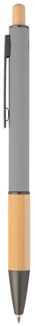 Kuličkové pero z recyklovaného hliníku s bambusovým úchopem a tlačítkem, pogumovaným tělem a kovovými částmi. S modrou náplní.