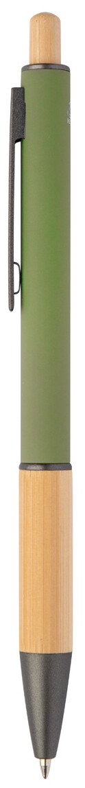 Kuličkové pero z recyklovaného hliníku s bambusovým úchopem a tlačítkem, pogumovaným tělem a kovovými částmi. S modrou náplní.