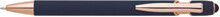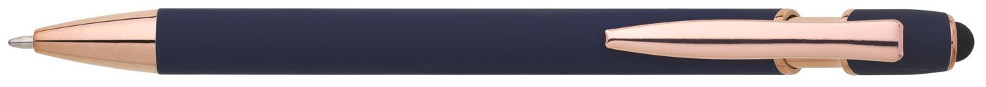 Kovová propiska se soft povrchem, touch koncovkou a doplňky v růžovo-zlaté barvě. Laserované logo je lesklé, růžovo-zlaté. Náplň modře píšící.