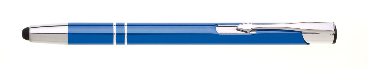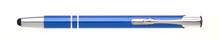 Modrá varianta oblíbené propisky ORIN, tentokrát s ukončením TOUCH. Lesklé tělo se dvěma stříbrnými proužky a stříbrnými doplňky.