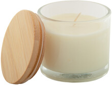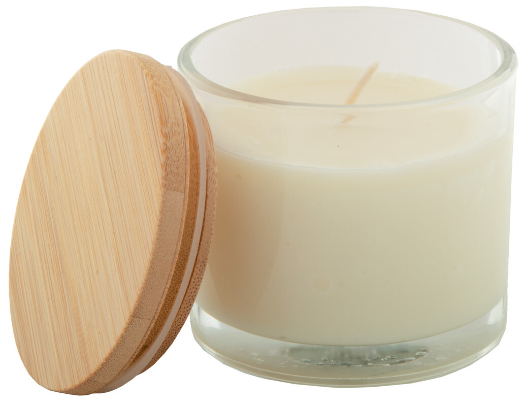 Rostlinná vosková svíčka s vůní vanilky ve skleněném držáku s bambusovým víčkem. S 95 gramy vosku. V kraftové papírové krabici.