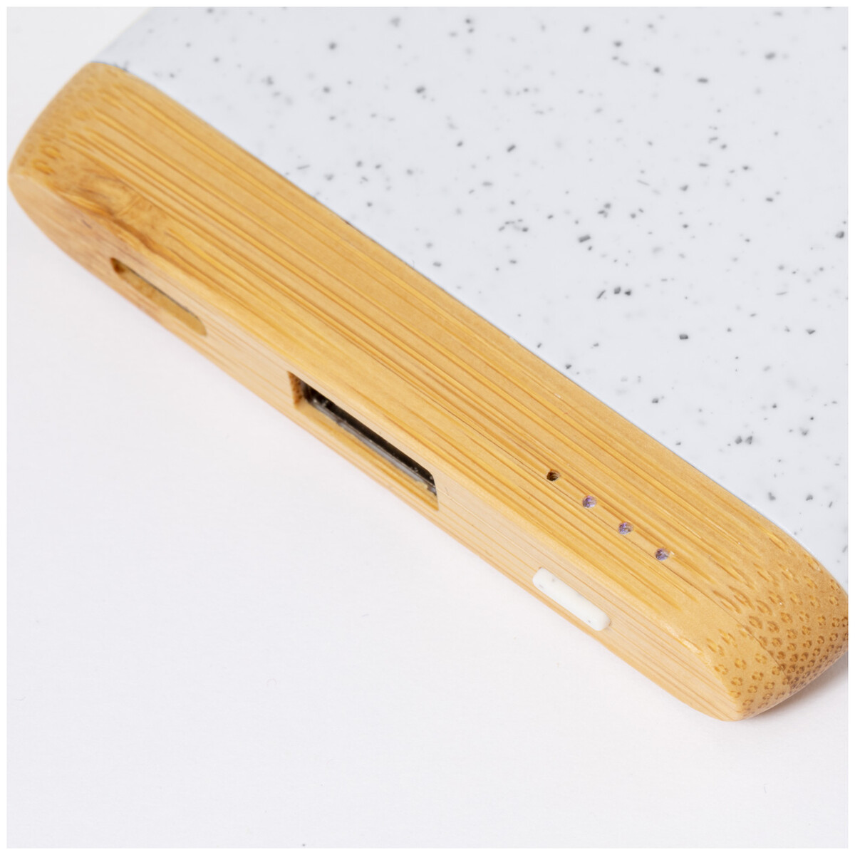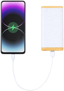 USB power banka z bambusu a ekologického plastového krytu z pšeničné slámy s 5000 mAh baterií. S 1 portem USB a 1 portem USB-C pro nabíječku. Vstupní port USB-C. Včetně USB nabíjecího kabelu.