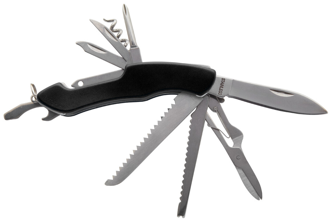 Kapesní nůž z nerezové oceli s 12 funkcemi a hliníkovou rukojetí.