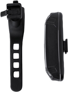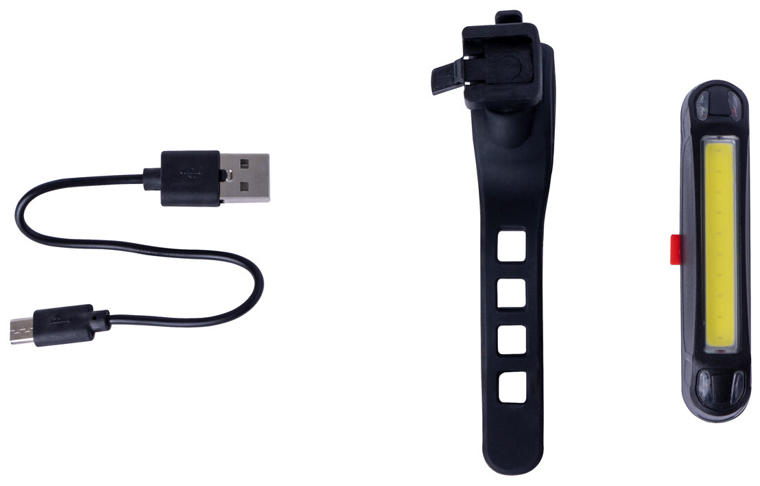 ABS plastové světlo na kolo s vysoce výkonným COB světlometem (bílé a červené světlo), vestavěnou USB dobíjecí baterií (350 mAh) a elastickým popruhem. S pevným a blikajícím režimem světla. Včetně USB nabíjecího kabelu. Neprodejné v následujících zemích: Německo, Rakousko, Švýcarsko.