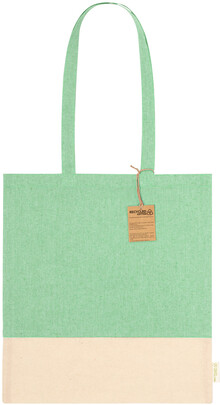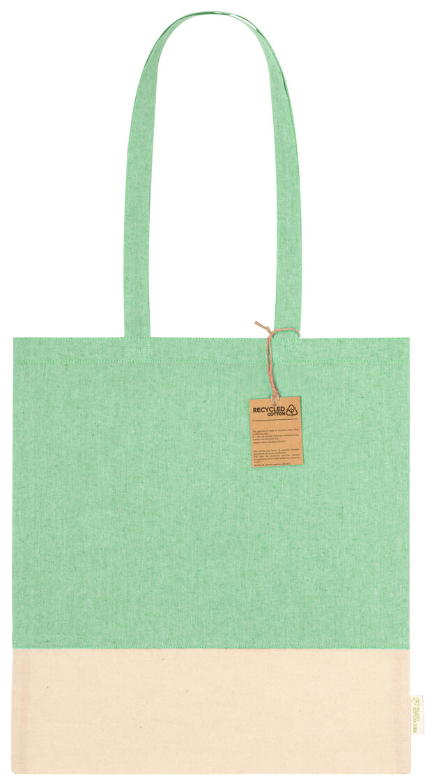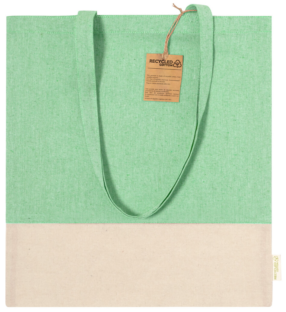 Dvoubarevná nákupní taška z recyklované bavlny s dlouhými uchy a výrazným štítkem z recyklované bavlny. 100% recyklovaná bavlna, 120 g/m2.