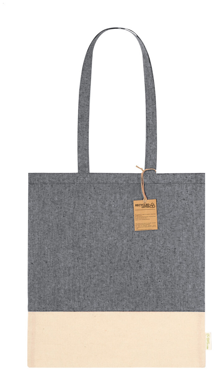 Dvoubarevná nákupní taška z recyklované bavlny s dlouhými uchy a výrazným štítkem z recyklované bavlny. 100% recyklovaná bavlna, 120 g/m2.
