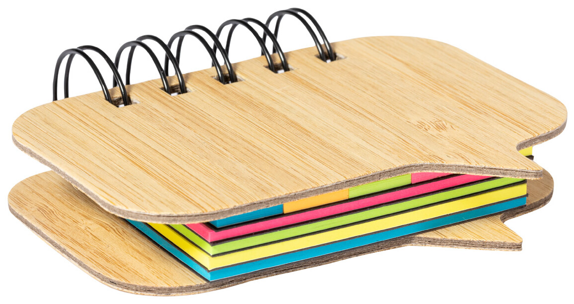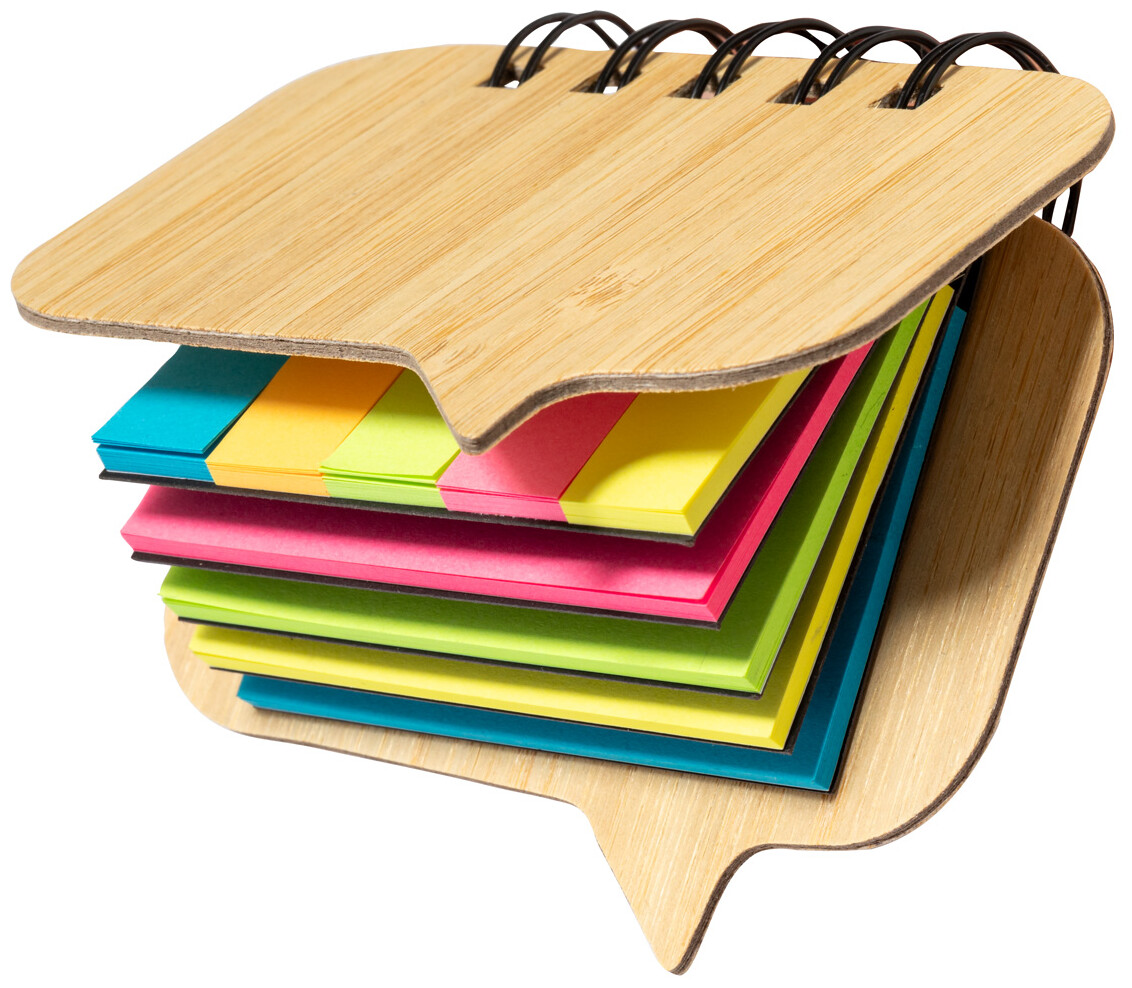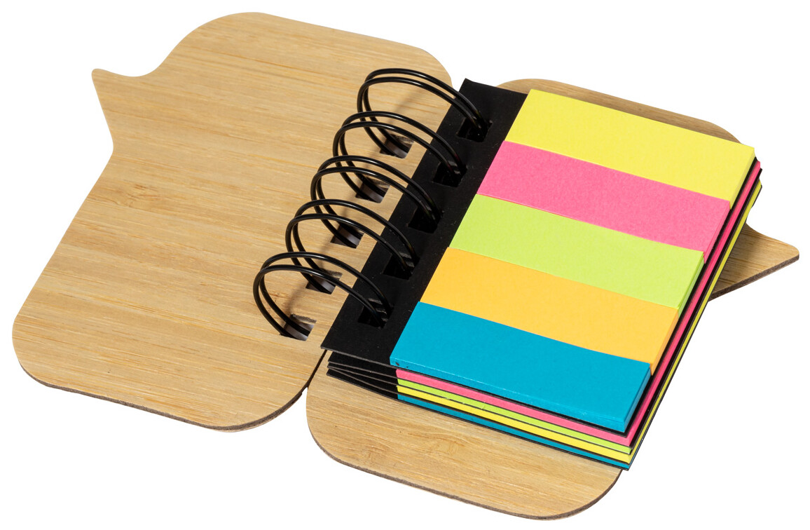 Poznámkový blok ve spirále potažený bambusem se 100 velkými lepicími papírky (ve 4 různých barvách) a 125 značkami stránek (v 5 různých barvách).