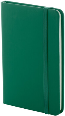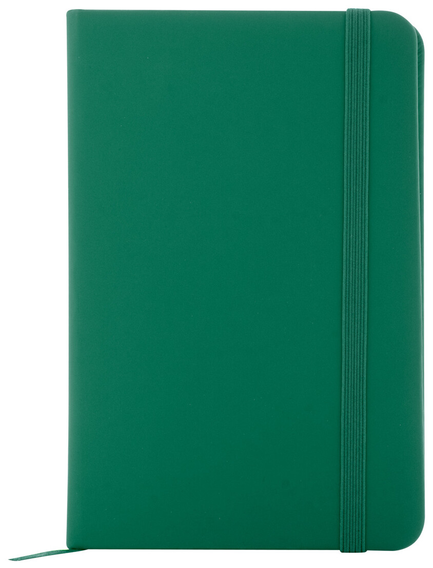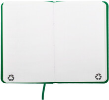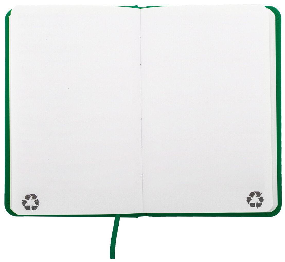 Blok A6 z recyklované PU kůže se 100 čistými listy z recyklovaného papíru. Se záložkou v odpovídající barvě a gumičkou.