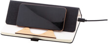 Blok A5 potažený polyesterem RPET s bambusovou vložkou, funkcí stojánku na mobil a vestavěnou bezdrátovou rychlonabíječkou (15W). S 80 linkovanými listy z recyklovaného papíru. Včetně USB nabíjecího kabelu.