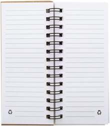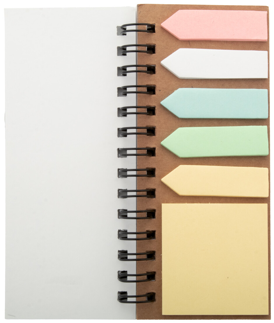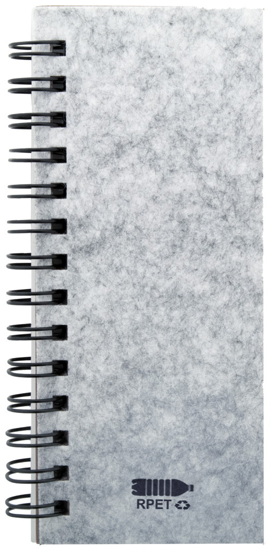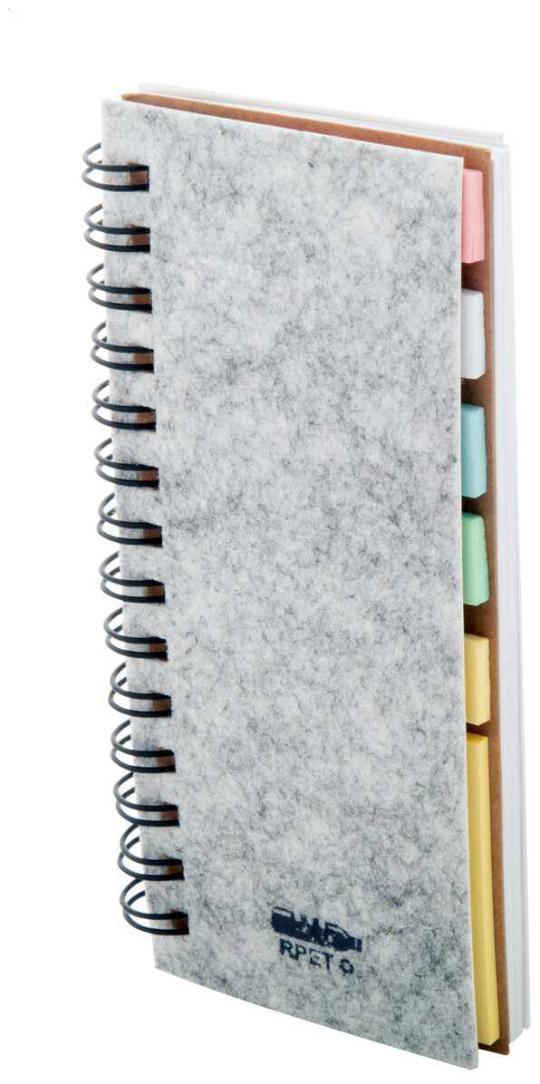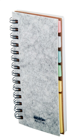 Spirálový blok potažený plstí RPET se 40 linkovanými listy z recyklovaného papíru, 25 lepicími papírky a 125 značkami stránek (v 5 různých barvách).