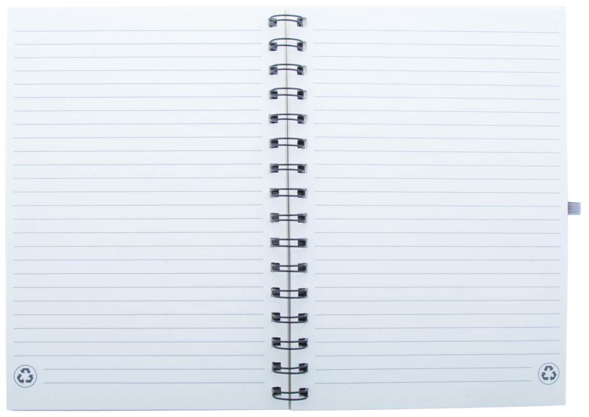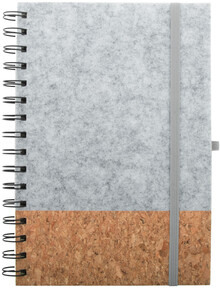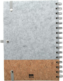 Spirálový blok A5 z RPET plsti a přírodního korku se 70 linkovanými listy z recyklovaného papíru. S gumovým páskem a držákem na pero.