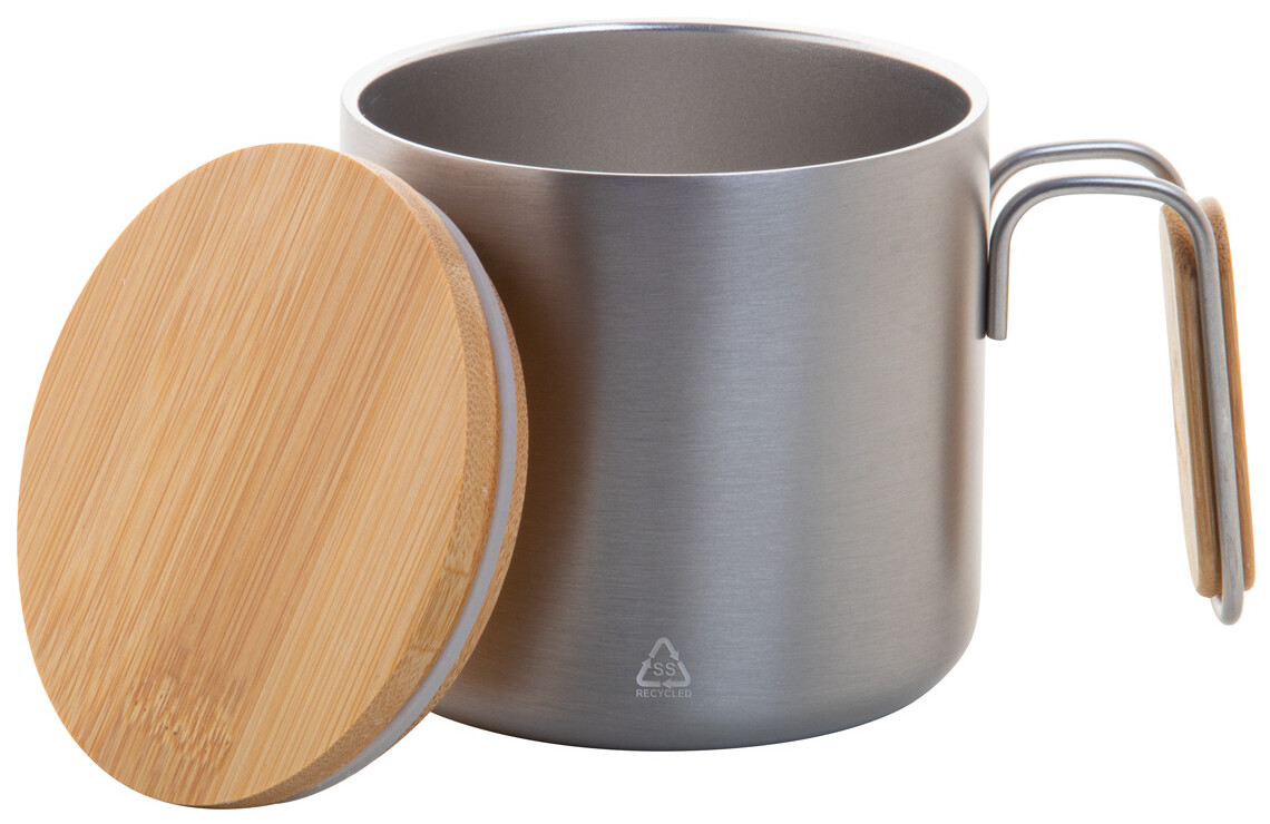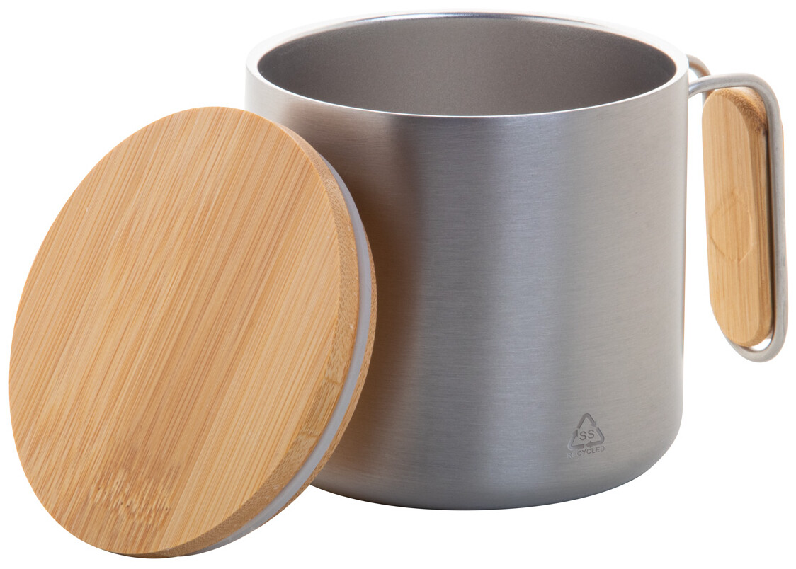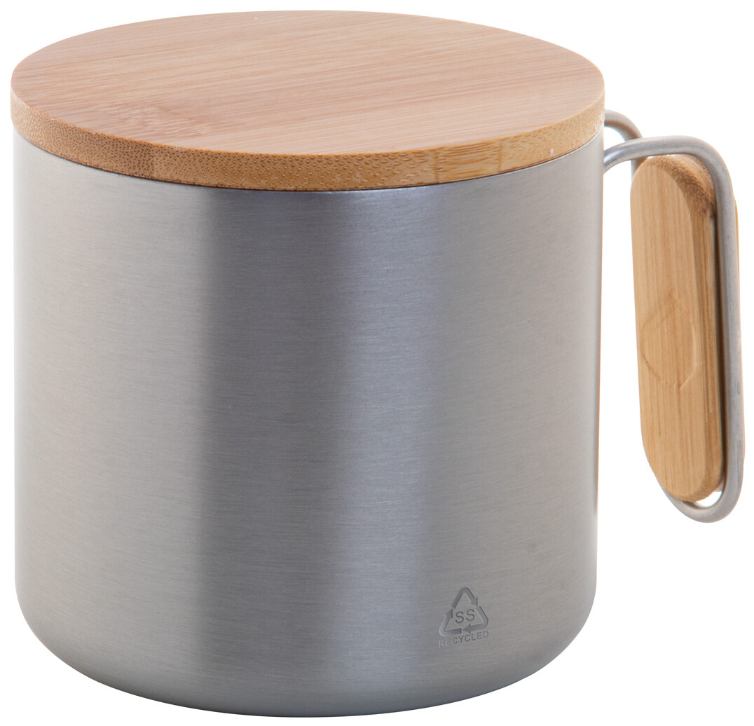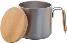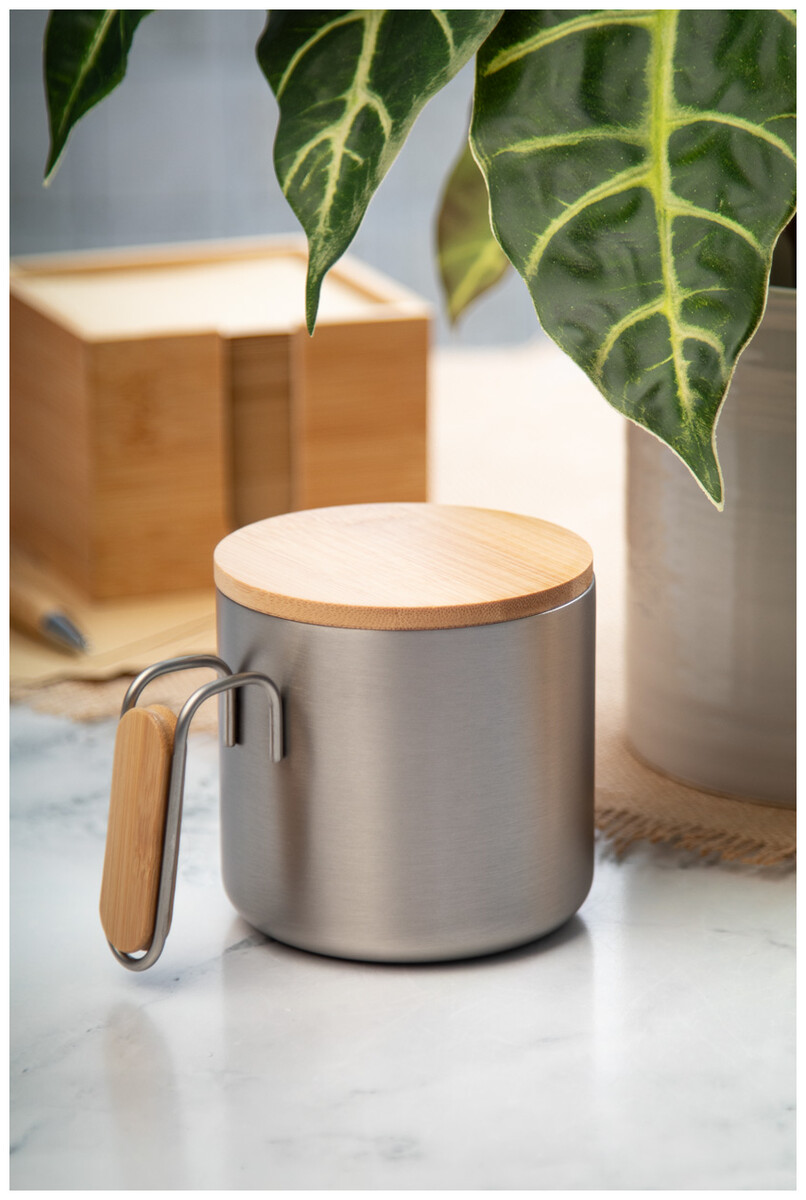 Dvoustěnný termo hrnek z recyklované nerezové oceli s bambusovým víčkem a rukojetí. 300 ml.