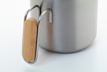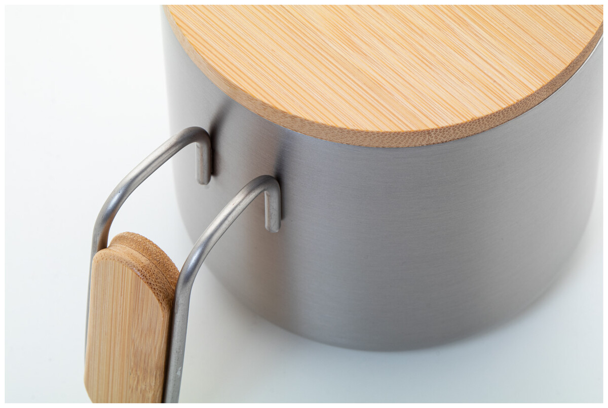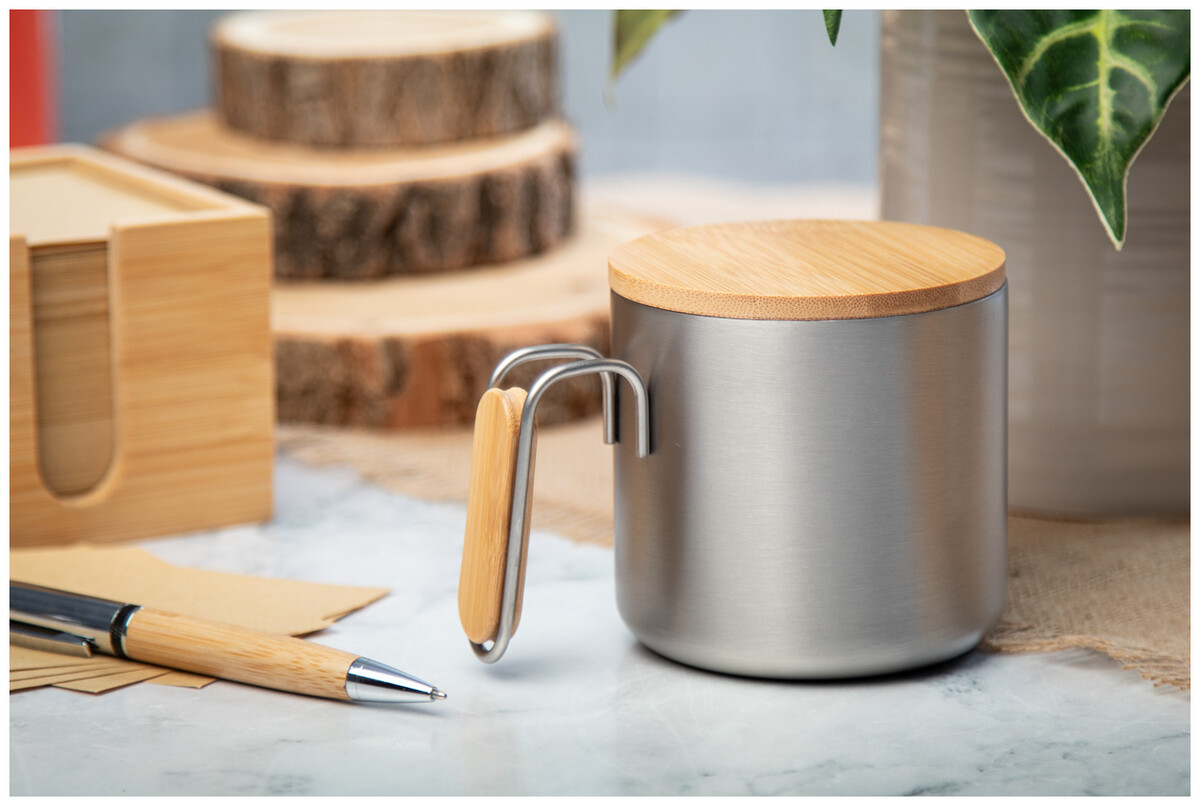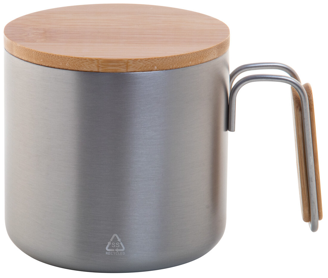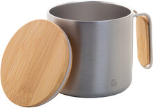 Dvoustěnný termo hrnek z recyklované nerezové oceli s bambusovým víčkem a rukojetí. 300 ml.