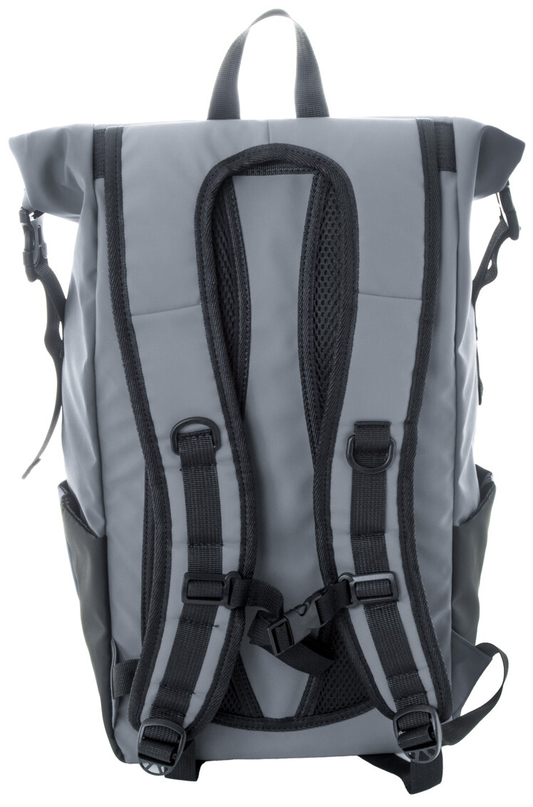 Vodotěsný rolovací batoh z RPET se zapínáním na přezku a suchý zip, polstrovaná přihrádka na notebook (16") a tablet (10"), přední kapsa na zip, boční kapsy, polstrovaná záda a ramenní popruhy. Polyester 600D RPET potažený PU, s výrazným štítkem RPET.