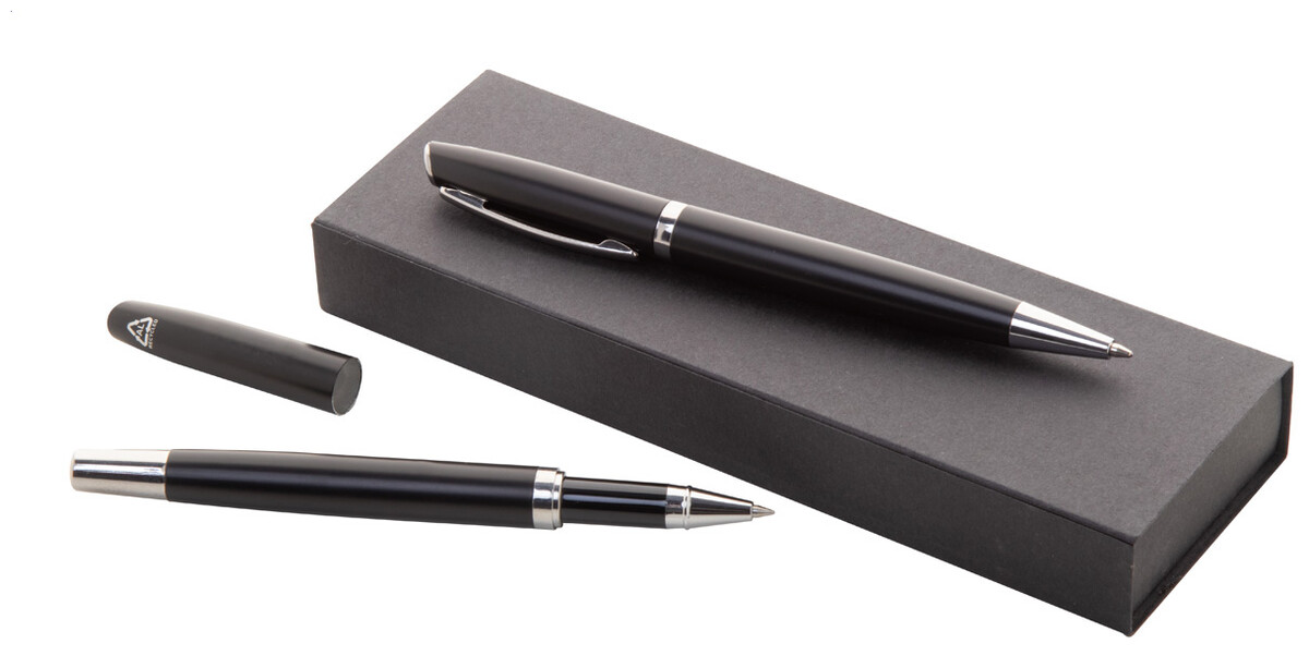 Sada per z recyklovaného hliníku s rollerem a kuličkovým perem v černé papírové dárkové krabičce. S modrou náplní.