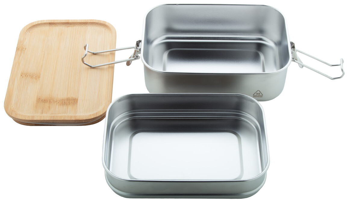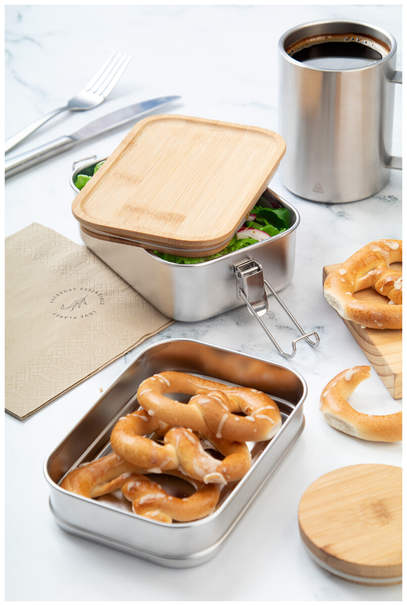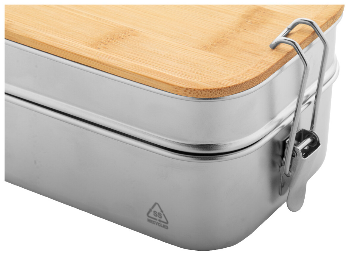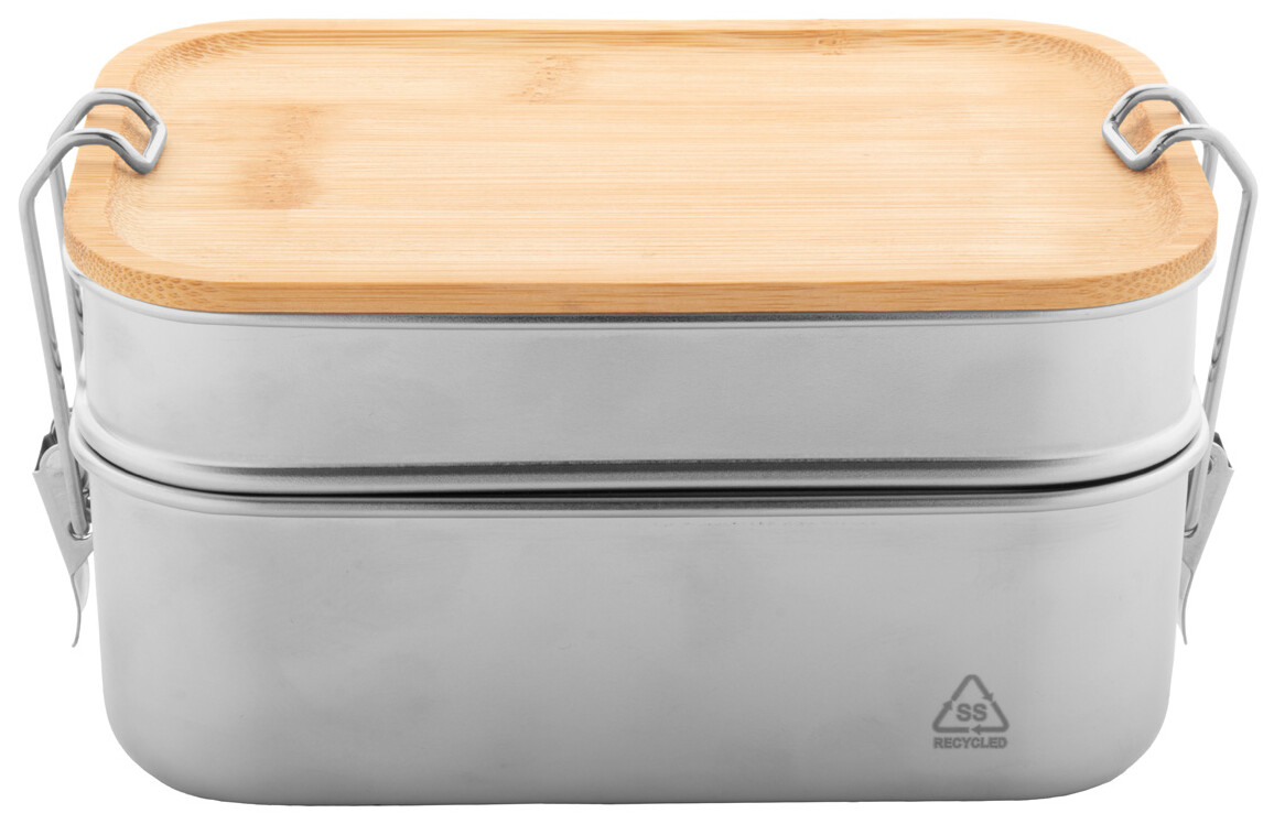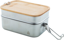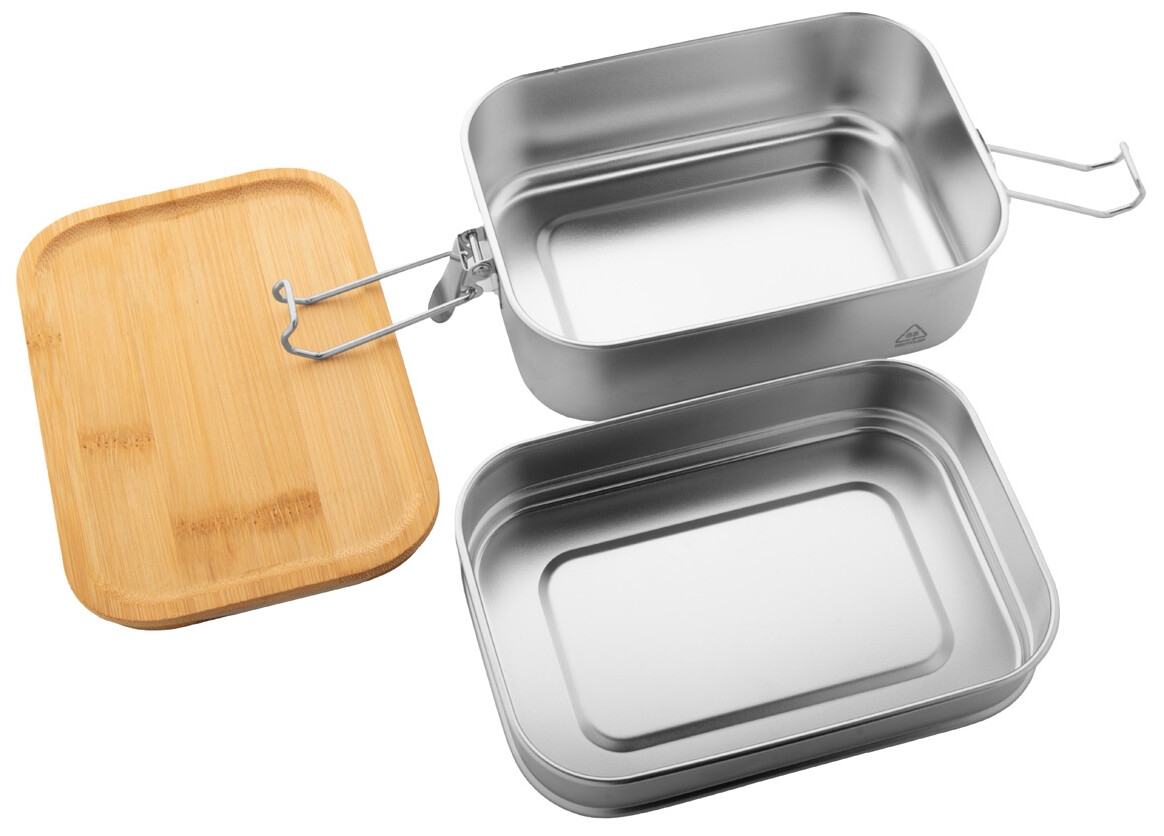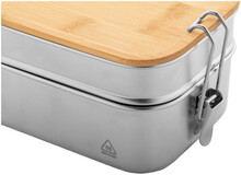 Box na jídlo z recyklované nerezové oceli s bambusovým víkem a bezpečným zavíráním na přezku. Se 2 přihrádkami o objemu 340 a 600 ml.