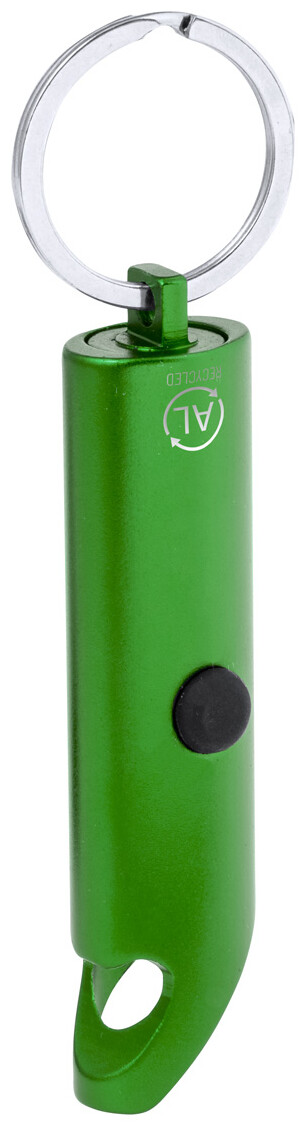 Mini svítilna z recyklovaného hliníku se 3 LED diodami, otvírákem na lahve a kroužkem na klíče. S knoflíkovou baterií.