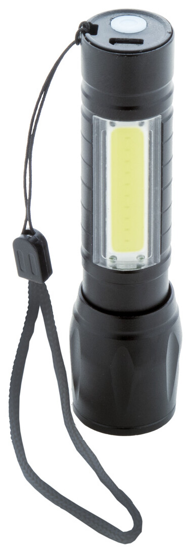 Hliníková baterka s vestavěnou USB dobíjecí baterií (400 mAh) a popruhem na přenášení. Se zoomovatelným vysoce výkonným COB světlem u písma a COB světlometem na boku. S pevným a blikajícím režimem světla. Včetně USB nabíjecího kabelu.