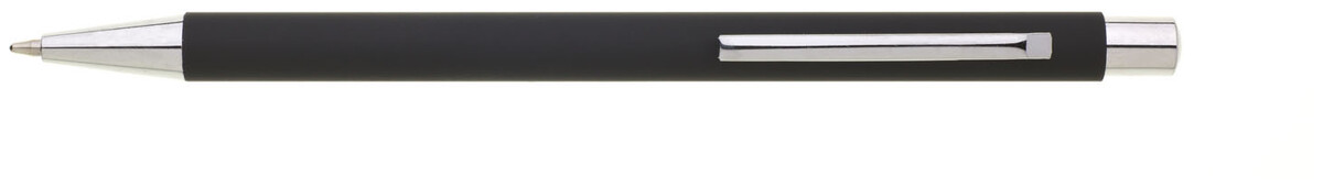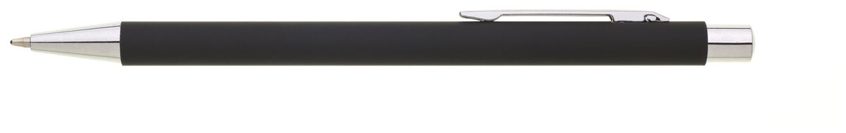 Tenká, jednoduchá propiska s černým pogumovaným tělem a chromovými doplňky. Náplň X20, modře píšící.