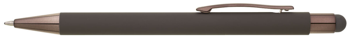 Šedé pogumované matné tělo propisky doplňují lesklé doplňky v barvě těla a matný touch konec. Logo po vylaserování je lesklé stříbrné. Velkoobsahová modře píšící náplň.
