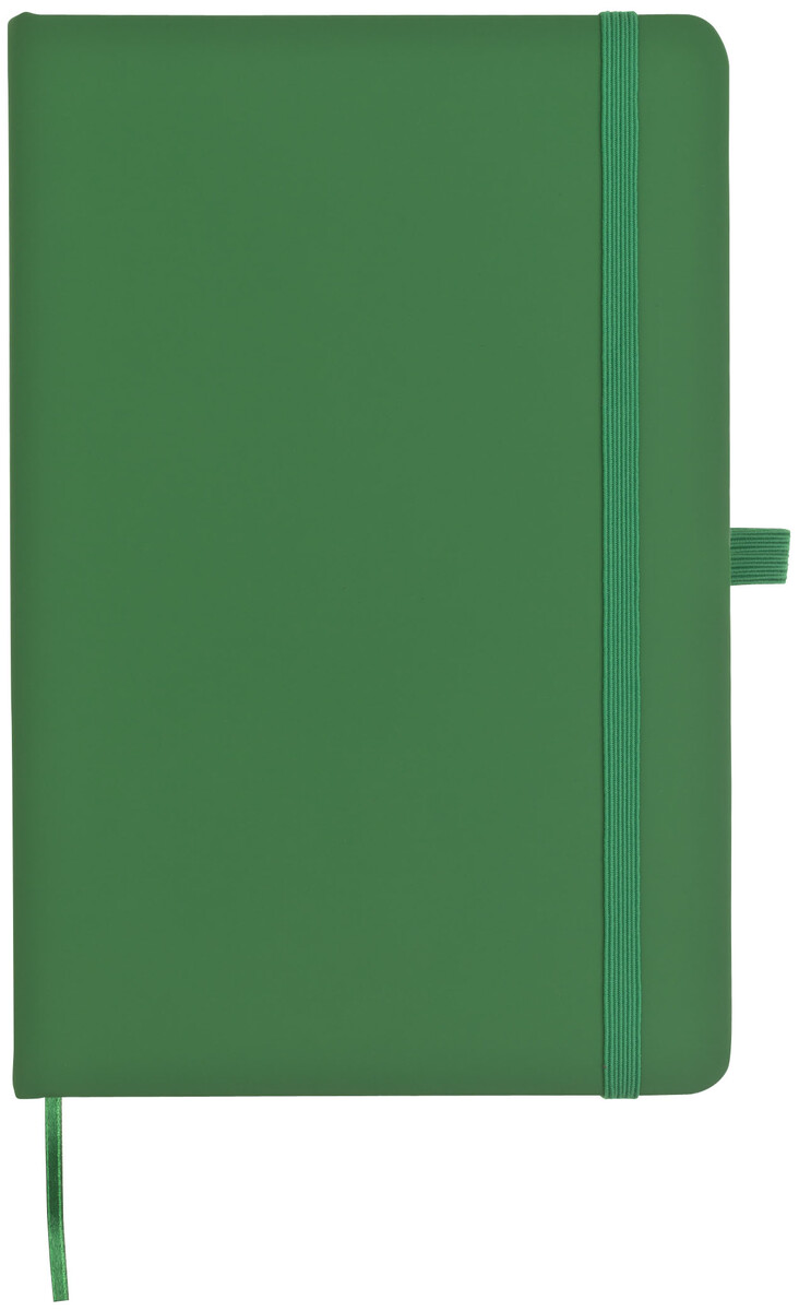 Zápisník A5 v zelených deskách z PU materiálu má 80 linkovaných listů. Blok má uzavírací gumičku, poutko na propisku a textilní záložku v barvě desek.